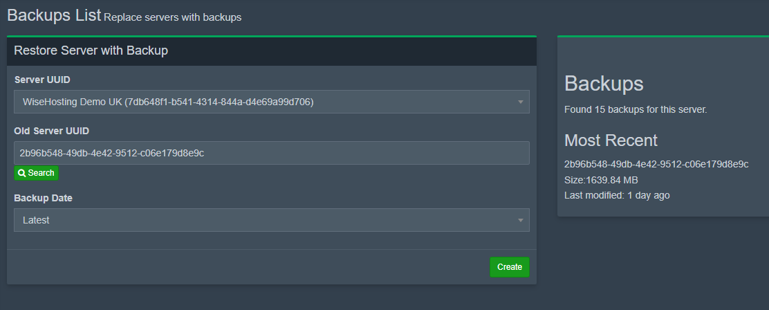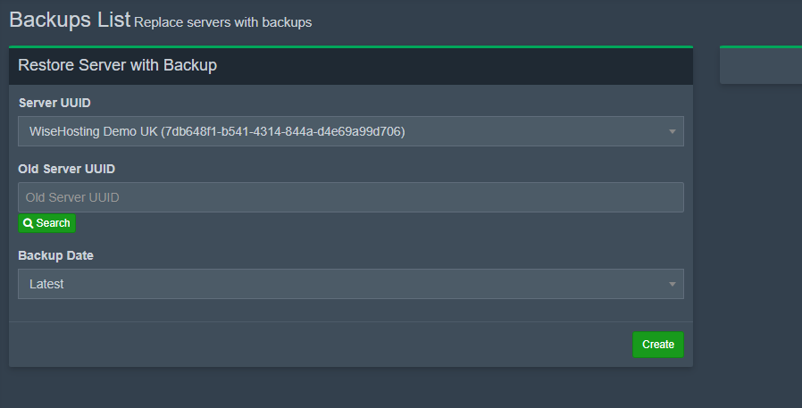 To restore this backup to another server, simply choose the server you want to restore the backup to in the "Server UUID" box and select which backup to restore. Once these steps are done, click "Create" and once the progress has started, close that window!
