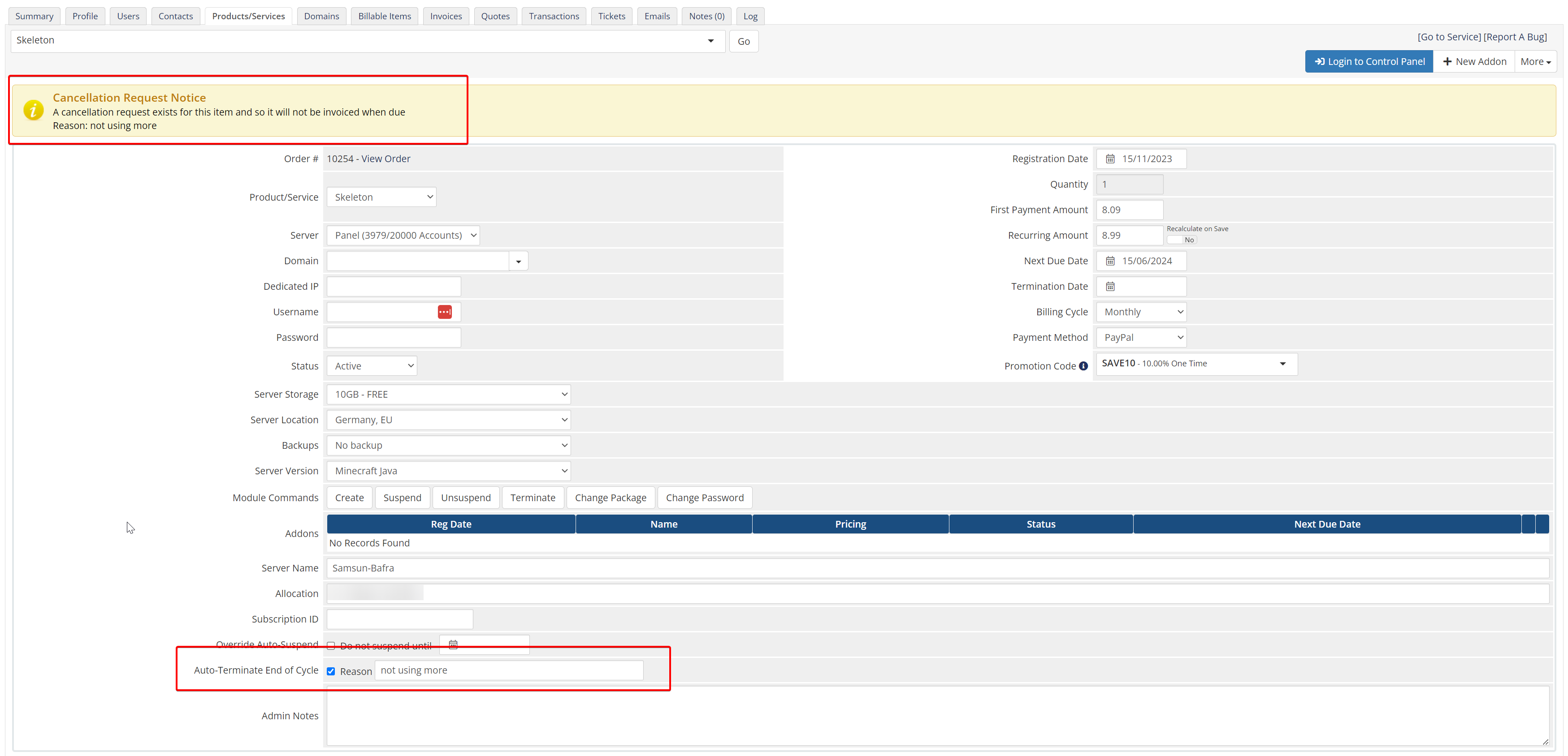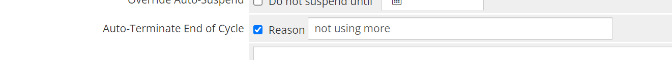 There first thing you can see is "Cancellation Request Notice". If requested, the reason is displayed there. This will stay on the top even after the server has been cancelled. The same goes with the "Auto-Termination End of Cycle" tick. Reason in that box = cancellation request reason.